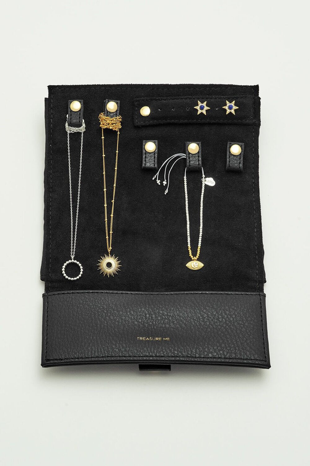 This black jewelry roll includes earring, necklace and bracelet holders and a zip-up pouch pocket. Ideal for carrying all your favorite pieces.
